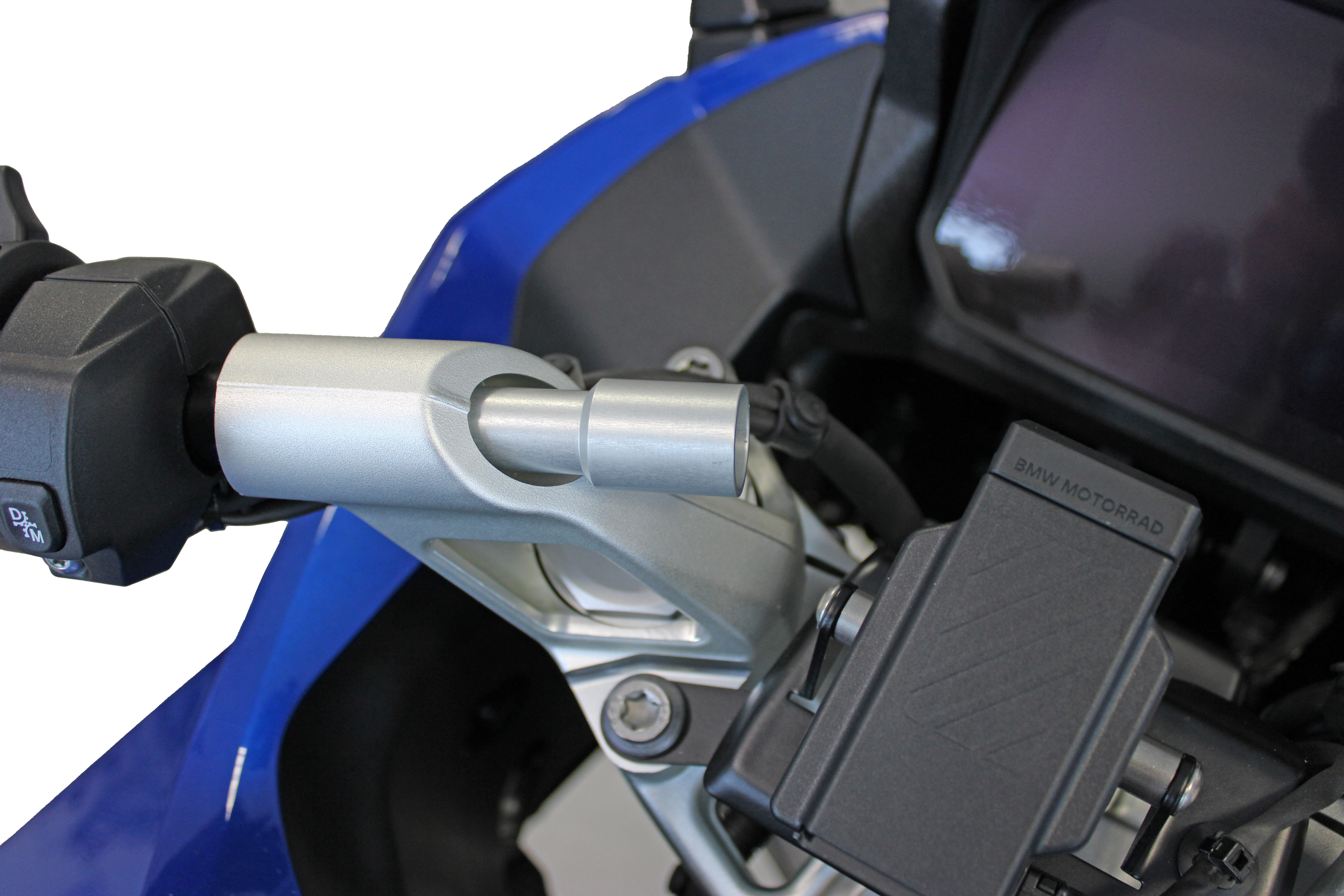 19.03.2026 - pour BMW R1300RT & R1300RS Avec cet adaptateur, les articles qui ont une pince de guidon tubulaire de 22mm peuvent être solidement fixés à la moto. L'adaptateur est vissé au guidon de l'intérieur. L'extrémité de 22mm d'épaisseur de l'adaptateur sert alors de support pour une pince de guidon. Cela peut être utilisé, par exemple, pour fixer solidement nos différents supports de smartphone.